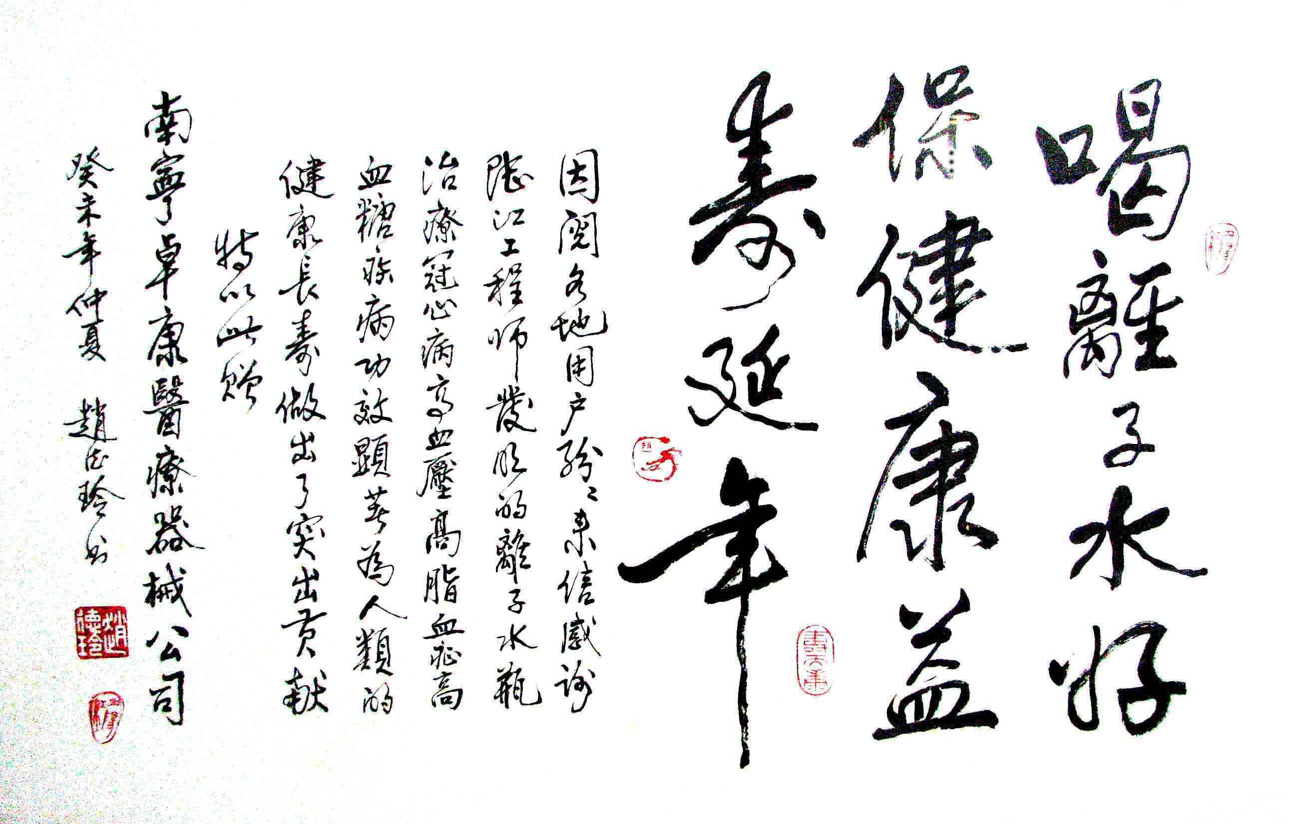 ---本品處理水用核磁共振測定值為55.82Hz(赫茲),為富含4-6個水分子小簇團的微小分子團水,可與世界各地長壽村水媲美。本品曾經三家省級醫院做臨床觀察,經北京和廣西醫學專家鑒定,22年來對以上病癥承諾療效,大量原發(fā)性高血壓患者飲用4至6個月內停藥,血壓正常穩(wěn)定,癥狀消除,逐漸逆轉至消除動脈粥樣硬化;冠心病患者在3至5個月內逐漸減輕至消除心痛胸悶,一年左右痊愈,心腦電圖正常。這是根據中國基礎醫學研究成果和生命科學原理轉化為醫學應用的杰出成果,使人從細胞到器官發(fā)展至全身健康。2型糖尿病患者使用3-10月內痊愈。中風后遺癥患者7-10個月改善至消除肢體和語言障礙。用戶最新報告:尿毒癥患者飲用兩個月,指標已經大為改善,適合腎衰和透析者使用。以上均為史無前例的轉化醫學應用,產品壽命30年,不換芯。
