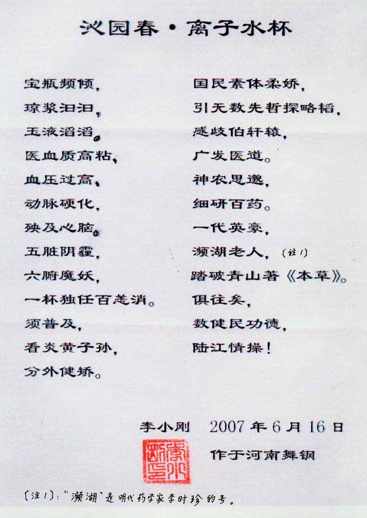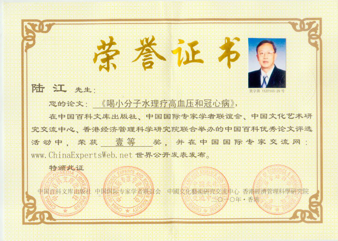 -----我是從事建筑的高工,本來沒有資格去攻克醫學難題,卻為了自身健康才扣響醫學的大門。由于我1990年患高血壓,因怕中風才研究發(fā)明了離子水瓶,我把水處理成微小分子團水,飲用后治愈了高血壓。便于1993年底送到三家省級醫院做臨床試用4個月。經北京和廣西醫學專家鑒定:"降脂降壓效果好"," 能擴大心腦動脈流量,改善心腦電圖以及微循環(huán)","對治療心腦動脈粥樣硬化、高血壓、高血脂有良好的醫療保健作用。""產品的技術性能和療效達到了同類產品的國內領先水平,經廣西醫學科學情報研究所檢索,未見國外有類似報道。"中國醫學科學院張正國教授從美國國立醫學圖書館數據庫存Medline檢索英俄文資料,均未見類似報告。2000年上市后,我為了對消費者負責而繼續(xù)觀察研究,一直通過《信譽卡》和《質量跟蹤調查書》向患者承諾療效,請用戶使用6個月后反饋效果。和脂壓患者飲用2至5個月內,消除癥狀,停服藥物,血壓正常;冠心病患者飲用3~5個月逐漸減輕至消除心絞痛、房顫等癥狀,不再服藥,飲用1年左右心電圖正常,經冠脈造影掃描無明顯狹窄,表明冠心病痊愈。大量患者還反映許多衰弱器官被修復,讓前列腺增生、慢性咽喉炎、慢性氣管炎、支氣管炎、慢性胃炎、腸炎和膽囊炎等不藥而愈;2型糖尿病患者是因為胰島衰弱致病,飲用該水半年至一年,逐漸減藥至停藥,血糖尿糖正常,真正治愈2型糖尿病。中風后遺癥患者飲用六七個月,可逐漸減輕至消除肢體和語言障礙,表明飲用該水能讓壽命很長的神經元細胞逐漸修復,奇跡般地恢復肢體和語言功能。飲用后還使胸腺和脾臟兩個重要的免疫器官被修復和增強,產生免疫細胞多,提高了免疫力,使人不生病或少生病。自此, 飲用微小分子團水創(chuàng)造了攻克冠心病、高(低)血壓和糖尿病三大醫學難題的奇跡。人們對此感到不可思議,但實踐是檢驗真理的唯一標準。