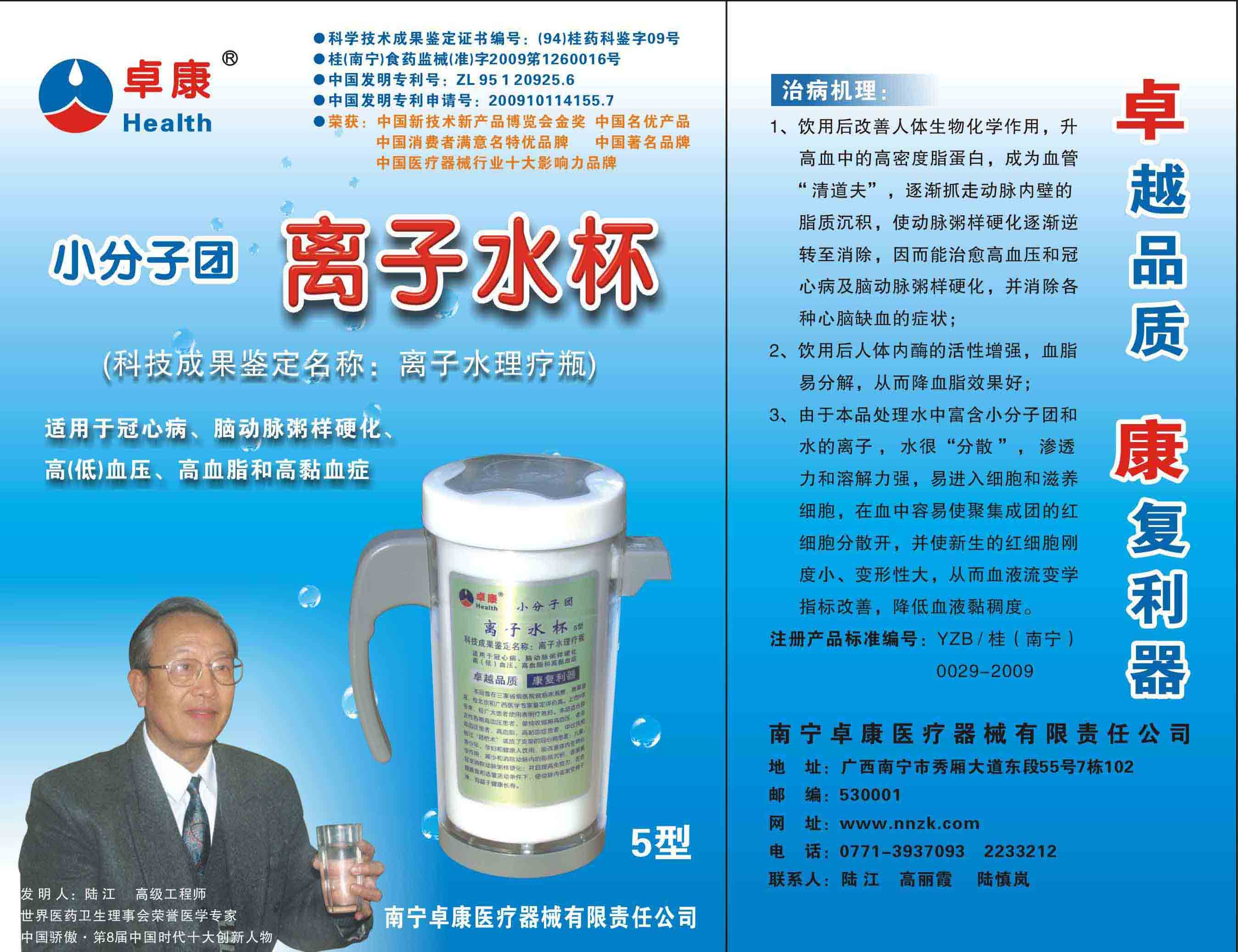本品大量用戶的使用效果表明,能治愈冠心病、腦動脈硬化、原發(fā)性高(低)血壓、高血脂、高粘血癥、高血尿酸癥(痛風)和2型糖尿病、衰弱器官并發(fā)癥(前列腺增生、腎衰與尿毒癥)及中風后遺癥等療效好。產品配信譽卡。使用壽命30年,不換芯,易清洗。團購優(yōu)惠。從郵局匯款,匯費1%,地址按本頁下方地址、聯系人寫。從銀行匯款,請點擊[聯系匯款]欄,從工商銀行匯款,建設銀行、農業銀行匯款,均免收匯費,匯款后20--30分鐘內發(fā)短信,可用微信轉帳,均免匯費,微信號即手機號13768308380。匯款后,告知你的姓名和地址,我公司聯系人手機號是:13768308380卓康牌離子水瓶為我公司獨家生產,郵購產品配《補水的大智慧》彩印書一本,另配四季出版社出版的新書《補水的大智慧》一本,并配光盤一張(含央視主持人釆訪陸江的對話視頻)。目前市場和"淘寶網"上有人兜售假冒的偽品,望讀者審察辯別真偽,造假者剽竊假冒本公司的各種證、獲獎獎項、專利號和外包裝盒上的中英文字,包括科技成果的鑒定意見等,請讀者注意防偽。如何識別假貨?已經買了假貨怎么辦?(請點擊[打假掠影][打假掠影])。